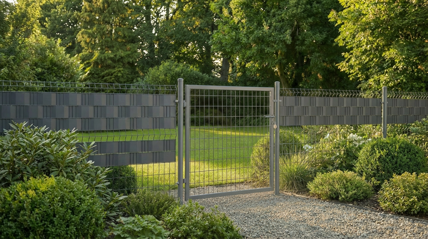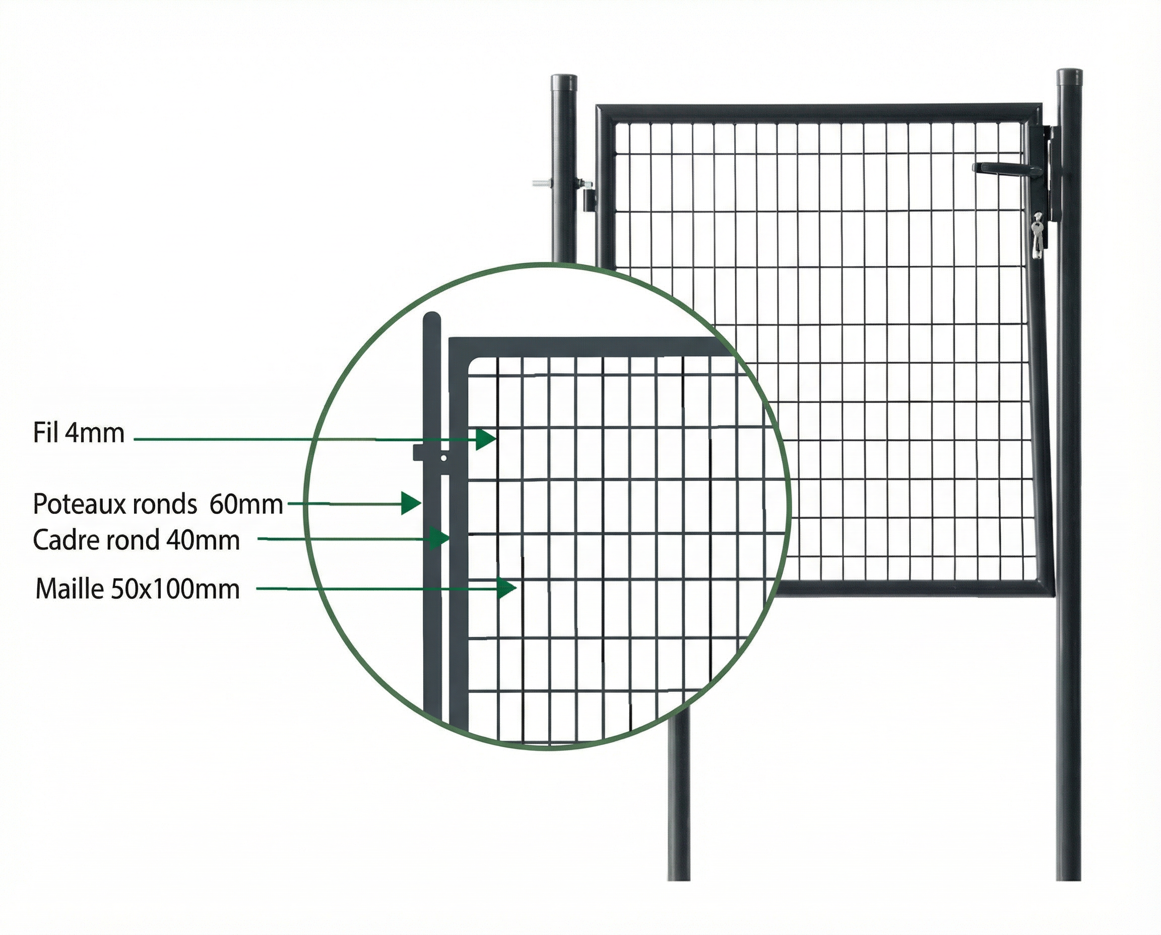 Le portillon standard large combine accessibilité et sécurité. Conçu pour répondre à la réglementation PMR, il offre un passage de 1,25 m pour un accès facile à tous. Sa maille 50 × 100 mm et son fil de 4 mm, associés à la finition RAL 7016 gris anthracite, garantissent solidité, durabilité et esthétique moderne.